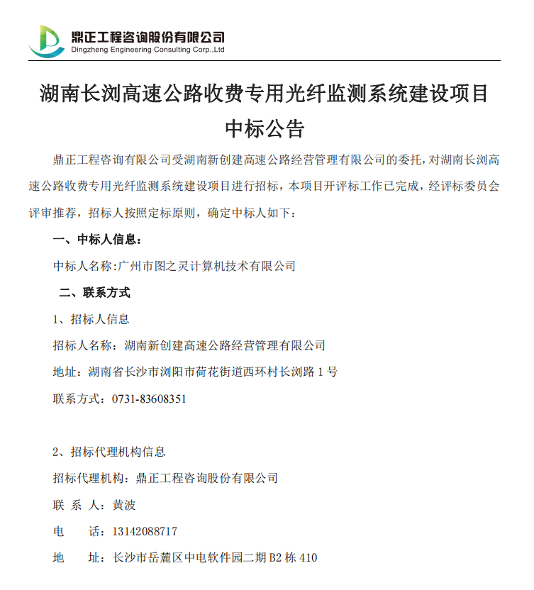 湖南長瀏高速公路收費(fèi)專用光纖監(jiān)測系統(tǒng)建設(shè)項(xiàng)目中標(biāo)公告
