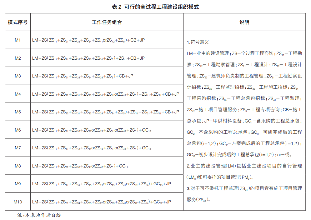 國家鼓勵多種形式的全過程工程咨詢服務模式,服務內容可以是跨階段組合或同一階段內不同類型的組合。據筆者調查,目前業界認可度較高的全過程工程咨詢內容主要包括勘察設計、招標采購、監理與施工項目管理服務以及工程專項咨詢。其中,工程勘察設計咨詢分為工程勘察設計和勘察設計管理服務兩種類型;工程專項咨詢包括項目融資、工程造價、信息技術等業主所需求的咨詢服務?;谶@一認識,筆者梳理了建設、勘察設計、監理、施工等單位在工程建設中的關系組合,并列出工程建設全過程主要的建設組織模式,如表2所示。
