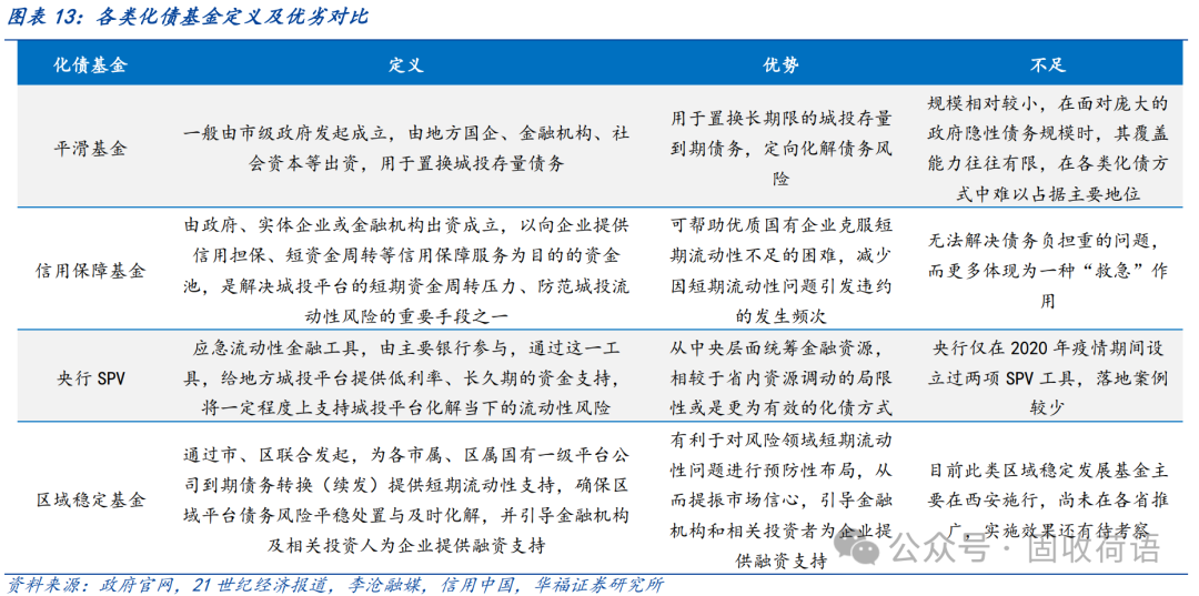 設立“化債基金”作為地方政府有效的管控城投債務風險的手段,被各地廣泛運用,包括平滑基金、信用保障基金、央行SPV等。基金資金主要來源于省內/市內,調動的是區域內的金融資源,但規模相對有限;SPV在投放貸款的同時或要求抵押品,因此國有資源更為豐富的區域預計將獲得更大的支持。