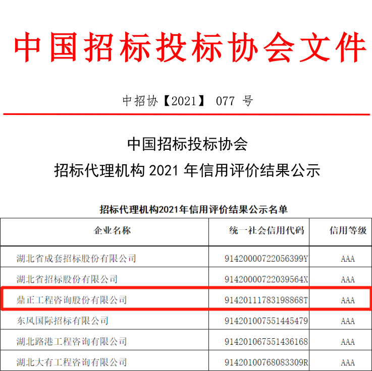 近日,中國招標(biāo)投標(biāo)協(xié)會(huì)頒布了招標(biāo)代理機(jī)構(gòu)2021年信用評(píng)價(jià)結(jié)果公示,鼎正工程咨詢股份有限公司繼獲得2021年度工程造價(jià)咨詢企業(yè)AAA信用評(píng)級(jí)后,再榮獲招標(biāo)代理機(jī)構(gòu)AAA信用評(píng)級(jí)!