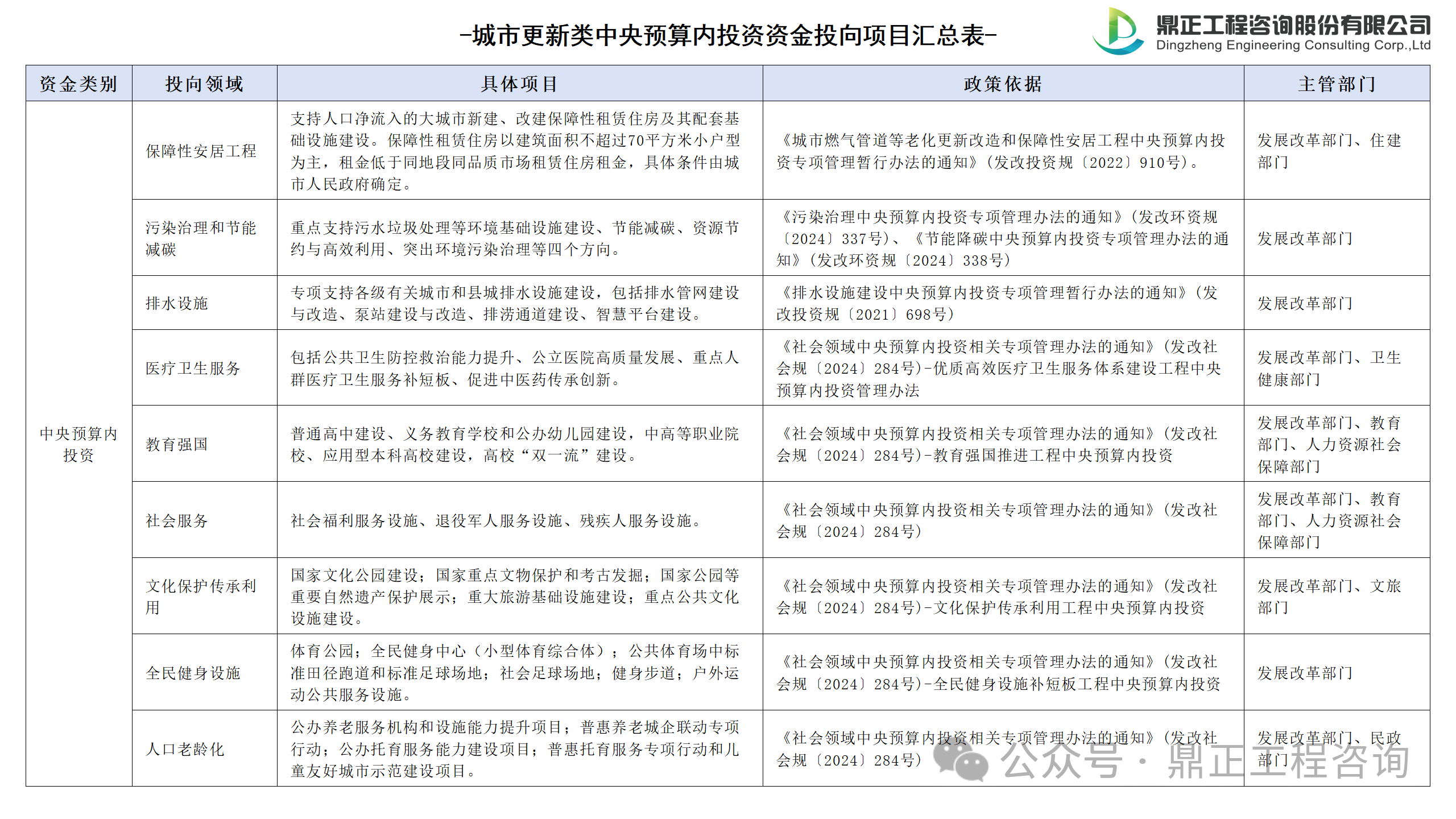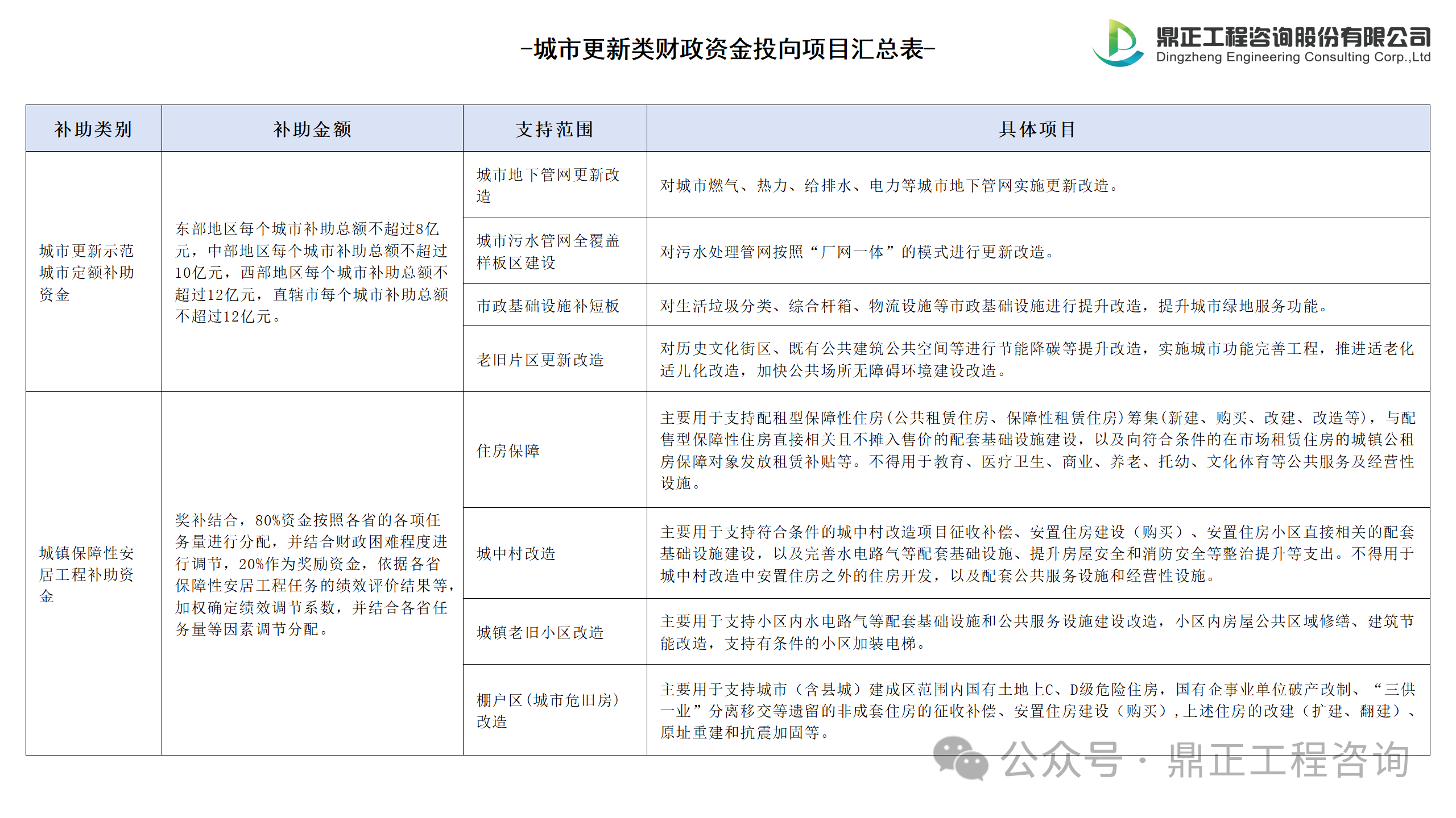 財政部、住房城鄉建設部于2024年4月30日聯合印發《關于開展城市更新示范工作的通知》,明確示范城市的中央財政補助資金重點支持四大方面:城市地下管網更新改造、城市污水管網全覆蓋樣板區建設、市政基礎設施補短板、老舊片區更新改造四大領域。具體項目上不得重復使用2023年增發國債資金、中央預算內投資、車購稅資金、超長期特別國債等其他渠道中央財政資金。