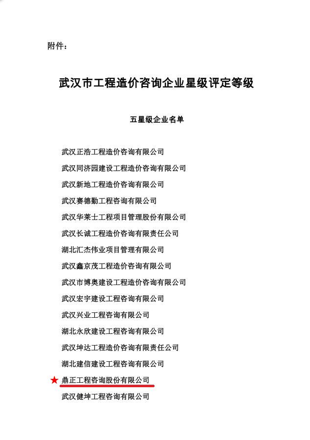我司獲武漢市工程造價咨詢企業星級評定五星級企業稱號