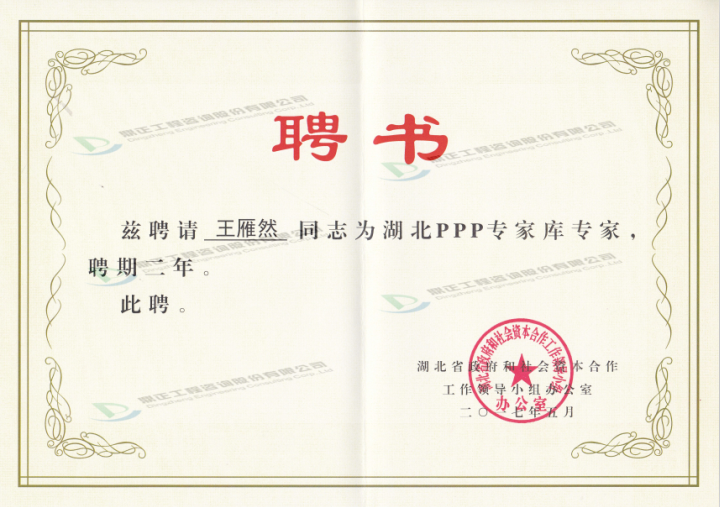 近日,湖北省政府和社會(huì)資本合作工作領(lǐng)導(dǎo)小組辦公室授予鼎正公司董事長(zhǎng)王雁然先生、副總經(jīng)理兼技術(shù)總監(jiān)朱立冬教授為湖北省PPP專(zhuān)家?guī)鞂?zhuān)家。此前,我司王雁然先生、朱立冬教授、張宏亮先生已入選湖北省財(cái)政廳PPP專(zhuān)家?guī)鞂?zhuān)家,另外,王雁然先生還被崇陽(yáng)縣人民政府聘為崇陽(yáng)縣PPP項(xiàng)目專(zhuān)家顧問(wèn)。