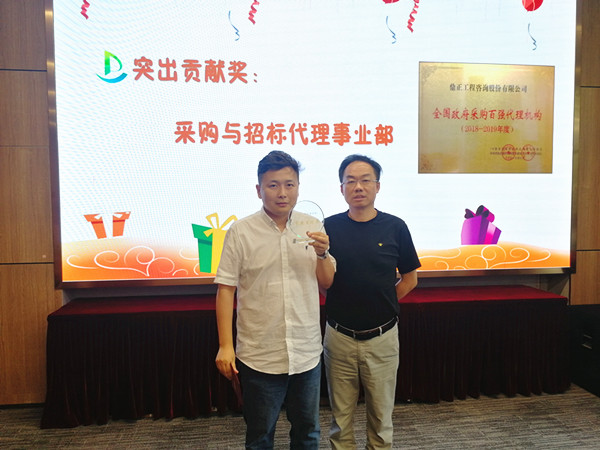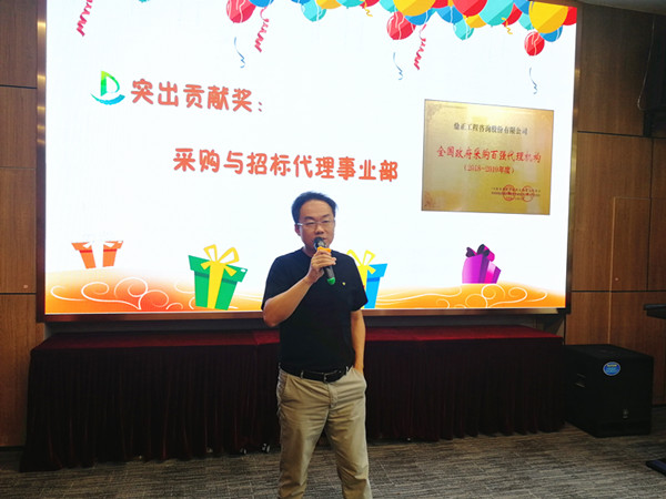 值得一提的是,今年七月我司憑借專(zhuān)業(yè)的服務(wù)、完善的內(nèi)控制度從近千家政府采購(gòu)代理機(jī)構(gòu)中脫穎而出,獲得首屆“全國(guó)政府采購(gòu)百?gòu)?qiáng)代理機(jī)構(gòu)(2018-2019年度)”榮譽(yù)稱(chēng)號(hào),這一榮譽(yù)稱(chēng)號(hào)離不開(kāi)采購(gòu)與招標(biāo)事業(yè)部全體成員積極主動(dòng)的參評(píng)。董事長(zhǎng)王雁然為采購(gòu)與招標(biāo)事業(yè)部頒發(fā)突出貢獻(xiàn)獎(jiǎng),并號(hào)召大家向采購(gòu)與招標(biāo)事業(yè)部學(xué)習(xí)大局意識(shí)和吃苦耐勞的工作作風(fēng)。