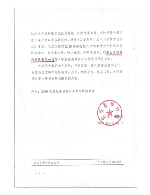 自2019年7月1日鼎正咨詢成為公安縣審計局的入庫合作單位以來,荊州分公司同事們在工程竣工結算審計過程中,精心組織、合理安排、嚴于律己、廉潔從審,在確保重點工程順利推進、節約政府資金、提高投資效益等方面做出了突出貢獻,得到了公安縣相關單位的一致好評,為公司贏得了信譽。