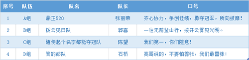 公司總部全員及分公司部分代表,共分為4個隊伍參賽。為保證全員參與且不受題目限制,全體員工跨部門分組,每組成員均由業務部門及非業務部門人員組成,最終分為A、B、C、D四組。