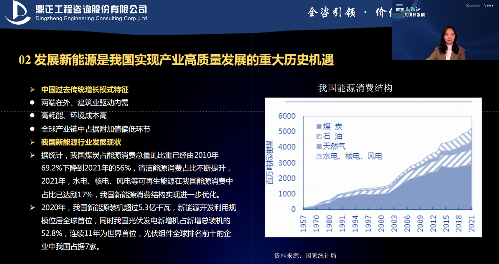 鼎正工程咨詢產業咨詢師常夢醒以“新能源產業政策研究”為主題,介紹了我國新能源產業的發展現狀,重點解讀了新能源行業的相關政策和未來發展趨勢,并從工程咨詢角度出發,介紹了鼎正近年來在綠色能源項目積累的先行經驗,給出了未來發展新能源產業的相關工作建議,為工程咨詢企業進入新能源市場提供思路與參考。